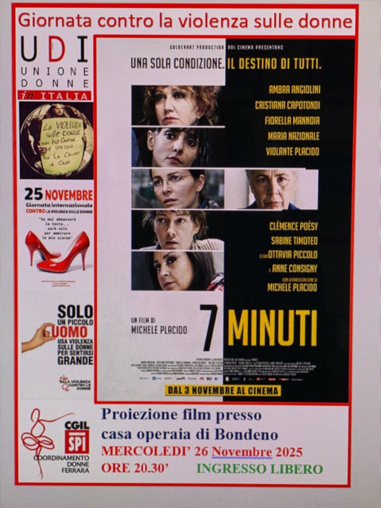 BONDENO Il 26 novembre alle ore 20,30, presso la Casa Operaia di Bondeno, in Viale Repubblica 26, in collaborazione con l’UDI, proiezione del film:” 7 minuti” di Michele Placido. Entrata libera.