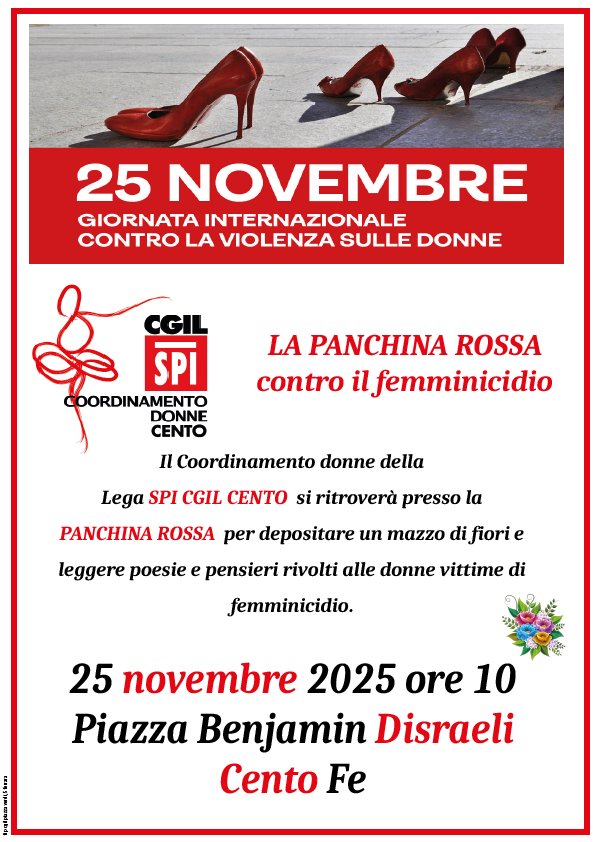 CENTO il 25 novembre, in piazza Benjamin Disdraeli, alle ore 10, cerimonia commemorativa, lettura di brani e di poesie davanti alla panchina rossa e deposizione di un mazzo di fiori. Parteciperà una classe dell’Istituto “G. Pascoli”. Sarà presente l’assessore alle Pari Opportunità Silvia Bidoli.