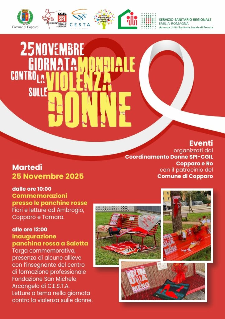 COPPARO il 25novembre dalle ore 10, deposizioni di fiori e letture presso le Panchine rosse di Ambrogio, Copparo e Tamara. Alle ore 12 inaugurazione della panchina rossa a Saletta con la presenza di allieve e insegnanti del Centro di formazione professionale Fondazione “ San Michele Arcangelo di CESTA.