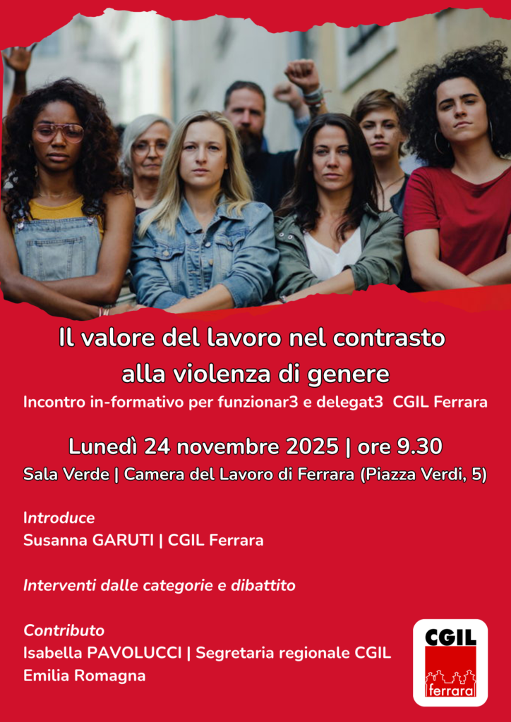 Cgil Ferrara organizza un seminario interno di in-formazione per delegati e funzionari, “Il valore del lavoro nel contrasto alla violenza di genere” con la partecipazione di Isabella Pavolucci della segreteria regionale CGIL Emilia Romagna per lunedì 24 novembre.