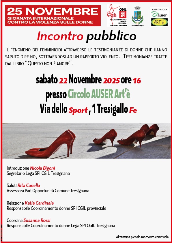 TRESIGALLO : sabato 22 novembre 2025 ore 16 presso Circolo AUSER Art’è via dello Sport, 1,incontro pubblico: “Questo non è amore” il fenomeno del femminicidio attraverso le testimonianze di donne che hanno saputo dire no sottraendosi a un rapporto violento.