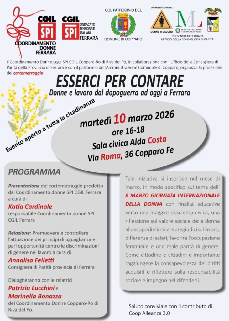 Copparo: Martedì 10 marzo dalle 16 alle 18, presso la Sala Civica Alda Costa, incontro pubblico e proiezione del cortometraggio “Esserci per contare”.