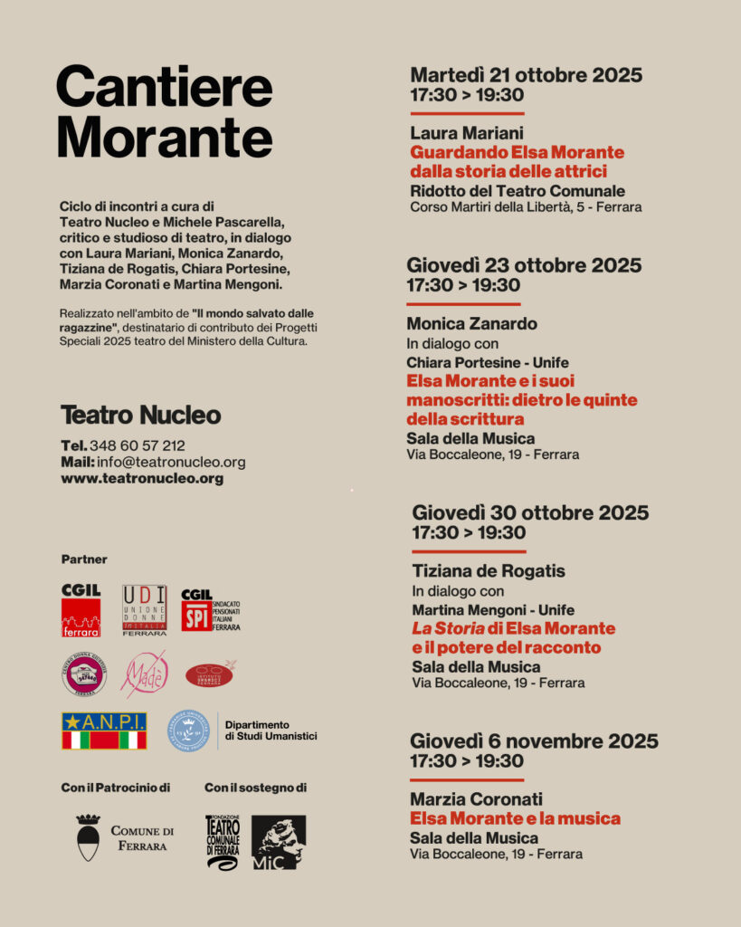 Un percorso di incontri, dialoghi e ascolti per attraversare l’opera e l’eredità di una delle voci più originali e radicali della letteratura italiana del Novecento. Con Cantiere Morante, Teatro Nucleo e Michele Pascarella, critico e studioso di teatro, propongono un ciclo di appuntamenti che, tra ottobre e novembre 2025, accompagneranno il pubblico in un viaggio tra letteratura, teatro, musica e impegno civile, preparando il terreno al debutto del nuovo spettacolo del gruppo: “Concerto teatrale per Elsa Morante – un caleidoscopio”, in scena martedì 25 novembre al Teatro Julio Cortazar di Pontelagoscuro alle ore 21:00.