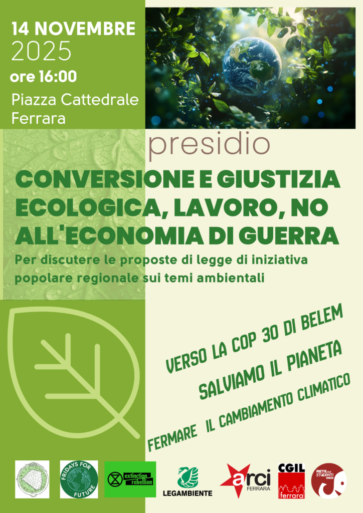 Venerdì 14 novembre alle ore 16 in Piazza Cattedrale a Ferrara si terrà il presidio “Conversione e giustizia ecologica, lavoro, no all’economia di guerra” in occasione dello sciopero globale per il clima.