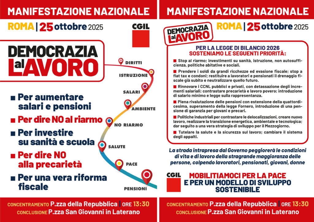 Per aumentare salari e pensioni, Per dire NO al riarmo, Per investire su sanità e scuola, Per dire NO alla precarietà, Per una vera riforma fiscale. Concentramento a P.zza della Repubblica, ore 13:30; conclusione a P.zza San Giovanni in Laterano