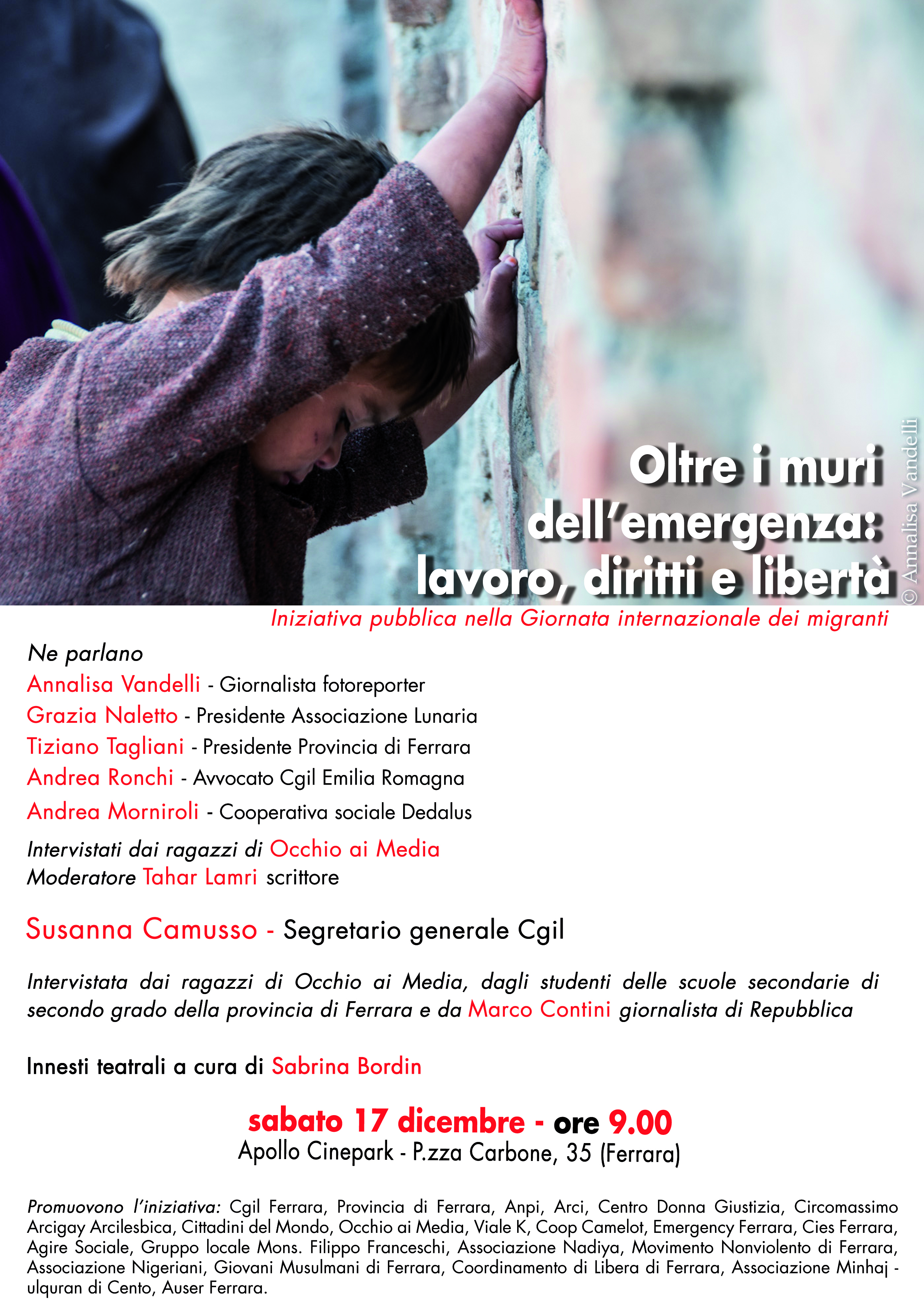 Sabato 17 dicembre alle ore 9 presso il Cinepark Apollo di Ferrara (Sala 1 – P.zza Carbone, 35) si terrà l’iniziativa pubblica “Oltre i muri dell’emergenza: lavoro, diritti e libertà” in occasione della Giornata internazionale dei migranti. Ne parlano Annalisa Vandelli giornalista e fotoreporter, Grazia Naletto presidente Associazione Lunaria, Tiziano Tagliani Presidente Provincia di Ferrara, Andrea Ronchi avvocato Cgil Emilia Romagna, Andrea Morniroli della cooperativa sociale Dedalus, intervistati dai ragazzi di Occhio ai Media. Lo scrittore Tahar Lamri sarà il moderatore dell’evento al quale parteciperà il segretario generale della Cgil Susanna Camusso, che sarà intervistata dai ragazzi di Occhio ai Media, dagli studenti delle scuole secondarie di secondo grado della provincia di Ferrara e da Marco Contini giornalista de La Repubblica.